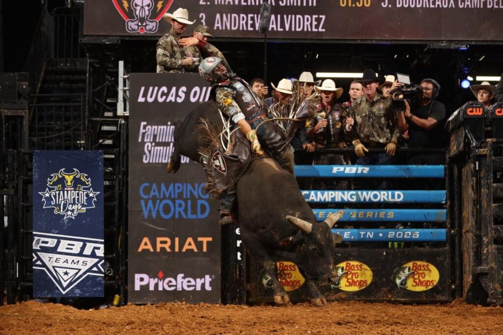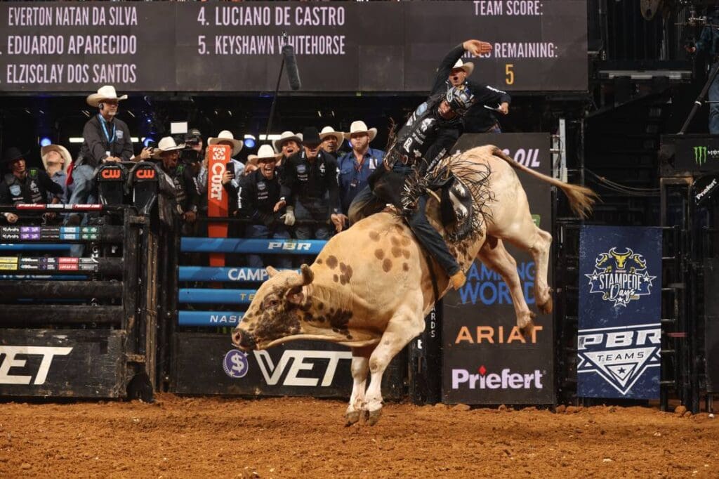 Nashville Stampede — Alan de Souza rode Let Him Fly for 83.5 points; Austin Richardson rode NashVegas for 83.75 points; Pablo Soares bucked off Slignin’ It in 2.20 seconds; Damiao Soares bucked off Landman in 3.43 seconds; Cody Jesus rode Ugly This for 88 points, Thunder Head Coaches Luke Snyder/Ross Coleman challenged a touch, ruled a qualified ride