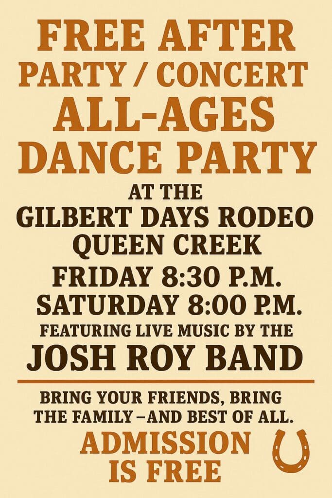Rodeo isnโt the only thing Gilbert Days has to offer! Multiple food and drink vendors will keep bellies full, while artisan and handcrafted goods vendors keep shoppers happy. When the dust settles after the Friday and Saturday night rodeo performances, the celebration continues at the Gilbert Days After Party & Concert. The best part? Itโs completely FREE! Bring the entire family and dance the night away to live music by the Josh Roy Band.