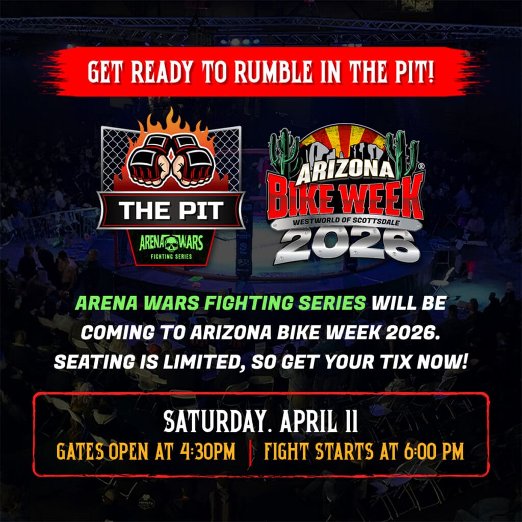 The HellRacer Dome may be one of the biggest adrenaline magnets at Arizona Bike Week, but it’s far from the only draw. The RockYard lights up Wednesday through Saturday with major rock and country acts, while the massive vendor area packs in everything from apparel and leather goods to custom bikes, accessories, tattoos, and more. The action doesn’t stop there, bike shows, stunt showcases, and combat sports round out the lineup, with “Bikes & Fights” from the Arena Wars Fighting Series taking over The Pit, the rally’s newest arena built for high‑impact excitement.