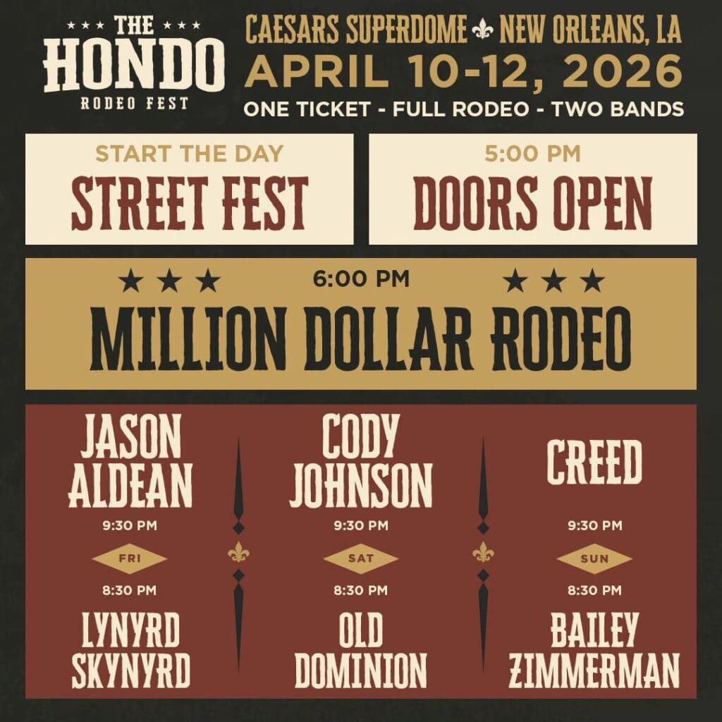 In 2026, The Hondo is headed south to New Orleans. After a breakout debut in 2024 and a sold‑out return in 2025, New Orleans becomes the festival’s next major expansion. With the city’s rich cultural backdrop and the Caesars Superdome’s ability to host more than 100,000 fans, NOLA offers the perfect stage for this rodeo‑meets‑music spectacle.
