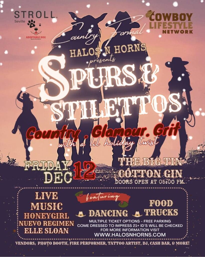 If you’re into good music, great company, and any excuse to dress up a little country, Spurs & Stilettos is your kind of night. Plus, you won’t want to miss Elle Sloan, Neuvo Regimen and Honeygirl bringing the music! Whether you’re coming with a friend, your whole crew, or flying solo, expect a laid-back, high-energy vibe with just the right amount of sparkle. So grab your ticket, dust off your boots, and let’s make some memories on December 12th – we can’t wait to party with y’all!