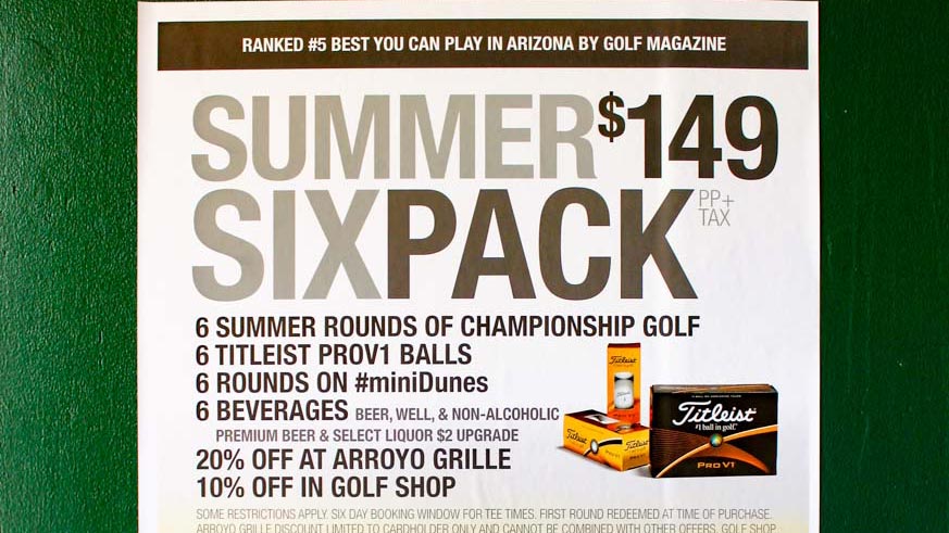 For just $149 plus tax per person, you can play six rounds of golf with a cart on this championship course and six rounds on #miniDunes. The #miniDunes course is a 6-hole short course built directly into the practice facility floor of the Ak-Chin Southern Dunes Golf Club and opens every day at 1pm excluding Mondays. You’ll also receive six beverages including beer or non-alcoholic drinks. There’s an optional $2 upcharge for select craft beers and liquors. Summer Six Pack participants also receive six Titleist ProV1 golf balls, 20 percent off their bill at the Arroyo Grille, and 10 percent off golf shop purchases. As you check in for your first round, you’ll receive your golf balls and punch card.