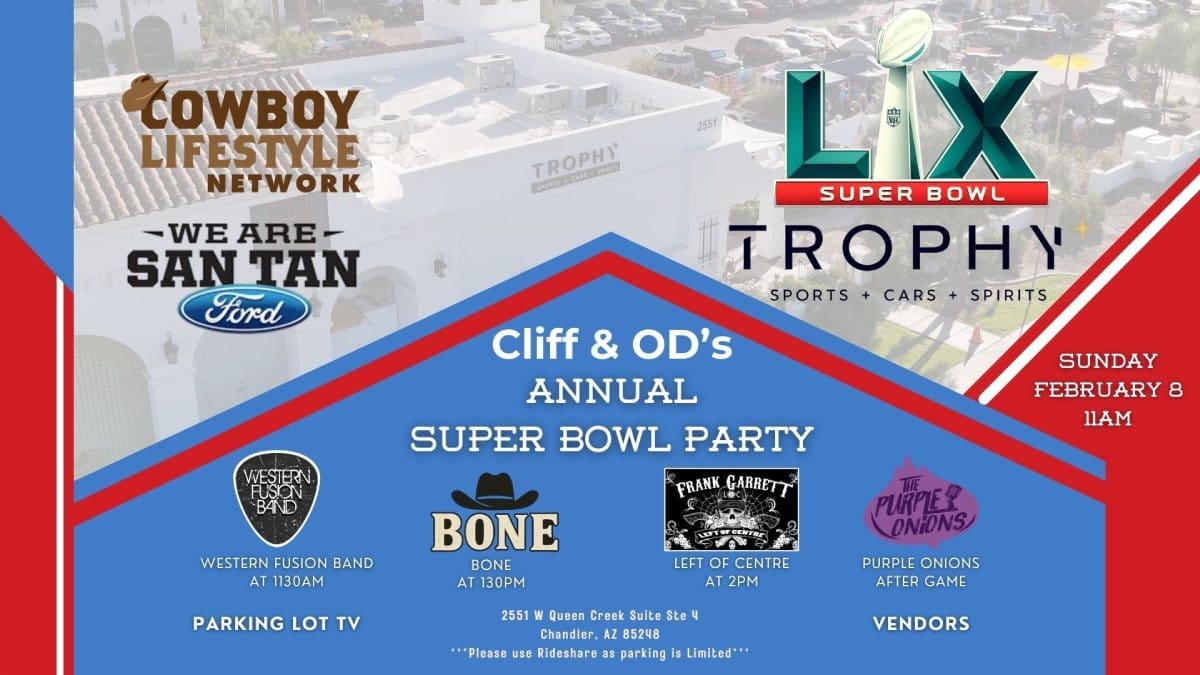 Forget the standard living room setup. If you’re looking for a game-day experience that combines high-stakes football with authentic cowboy spirit, you’ve found it. On Sunday, February 8th, 2026, Cliff and OD are taking over Trophy Bar at Downtown Ocotillo Plaza in Chandler for an all-day celebration that’s part tailgate, part concert, and 100% Western. We’ve got the massive Parking Lot TV ready to go, but those 59 prime seats inside will fill up fast, so get here early to claim your piece of the action!
