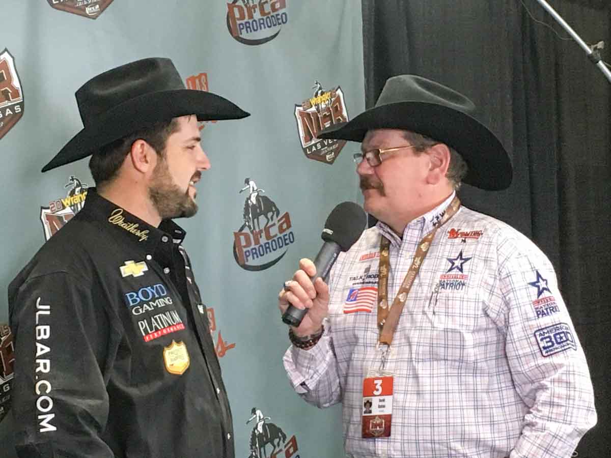 - Steer Wrestler, Luke Branquinho with a time of 3.5 seconds in Round 8 being interviewed in the WNFR 2015 Press Room